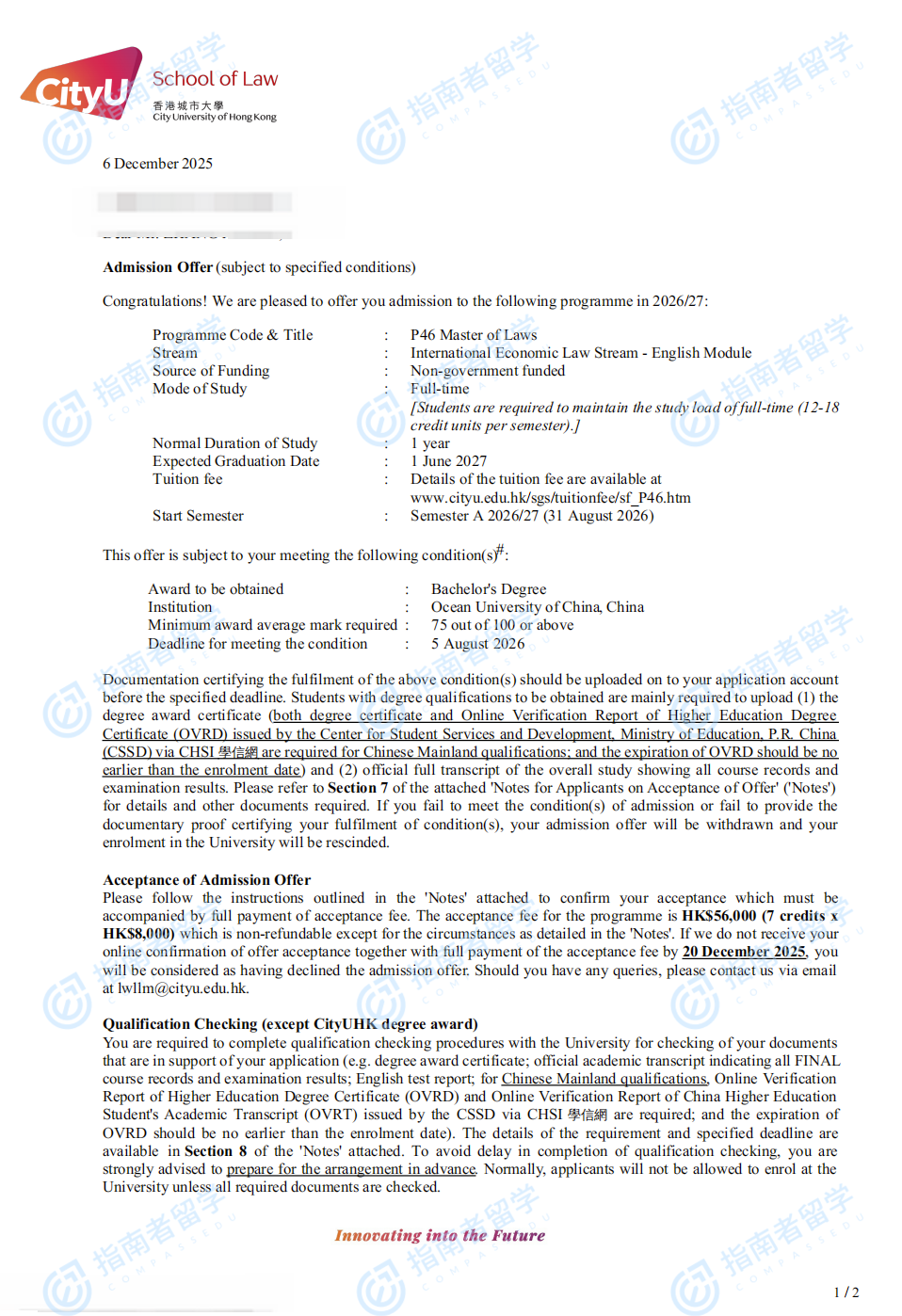 香港城市大學(xué)法學(xué)碩士研究生offer一枚