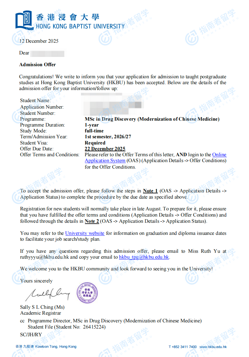 香港浸會(huì)大學(xué)藥物發(fā)現(xiàn)(中藥現(xiàn)代化)理學(xué)碩士研究生offer一枚