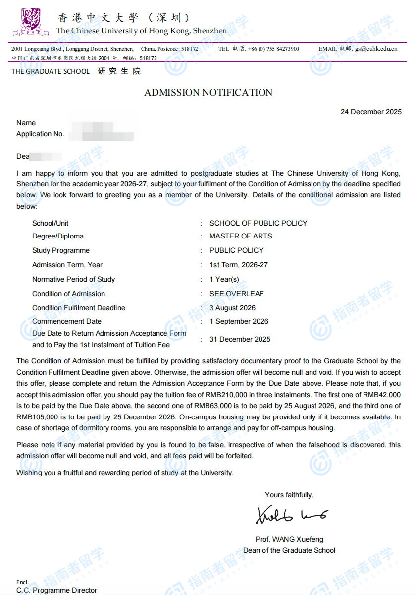 香港中文大學(xué)公共政策文學(xué)碩士(CUHK-Shenzhen)研究生offer一枚