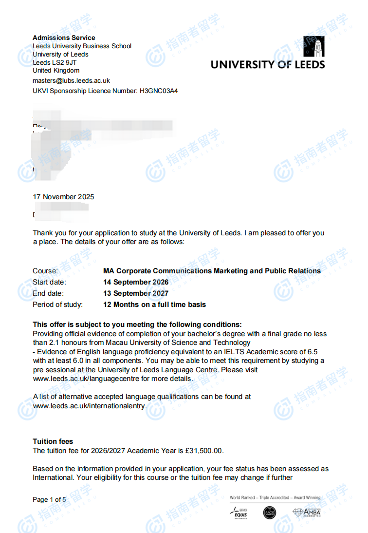 利茲大學(xué)企業(yè)傳播、市場(chǎng)營(yíng)銷(xiāo)與公共關(guān)系文學(xué)碩士研究生offer一枚