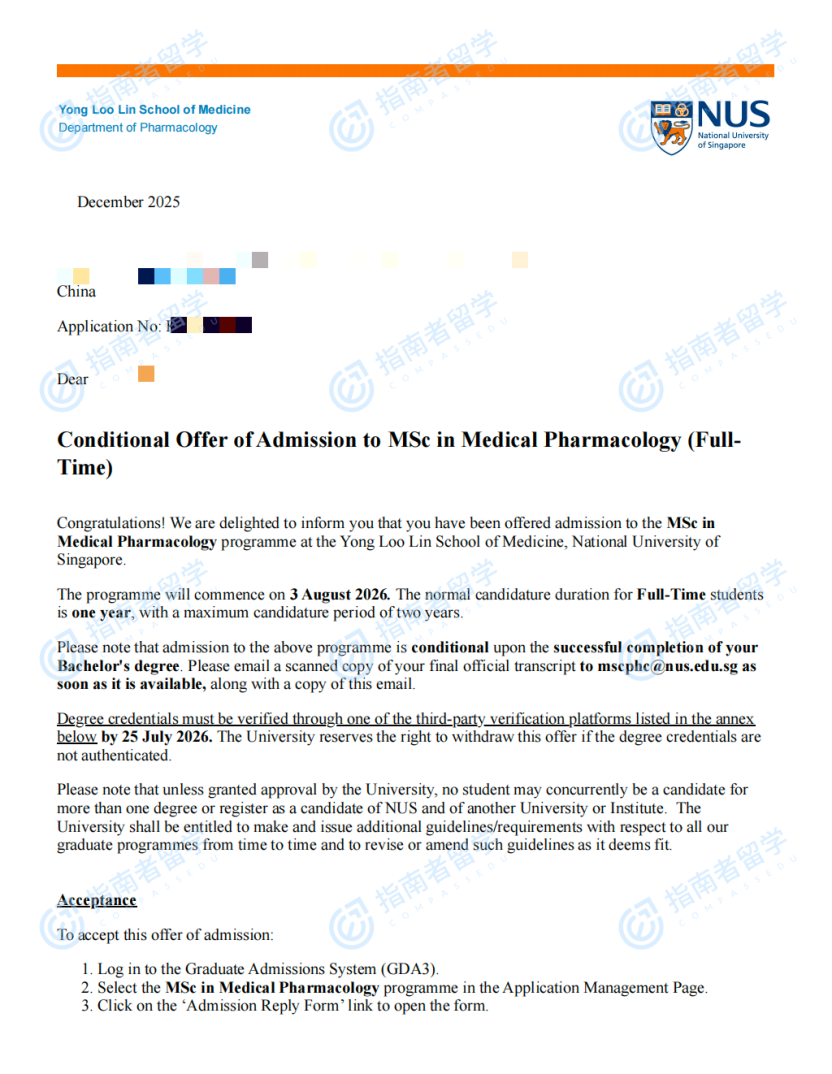 新加坡國立大學醫(yī)學藥理學理學碩士研究生offer一枚