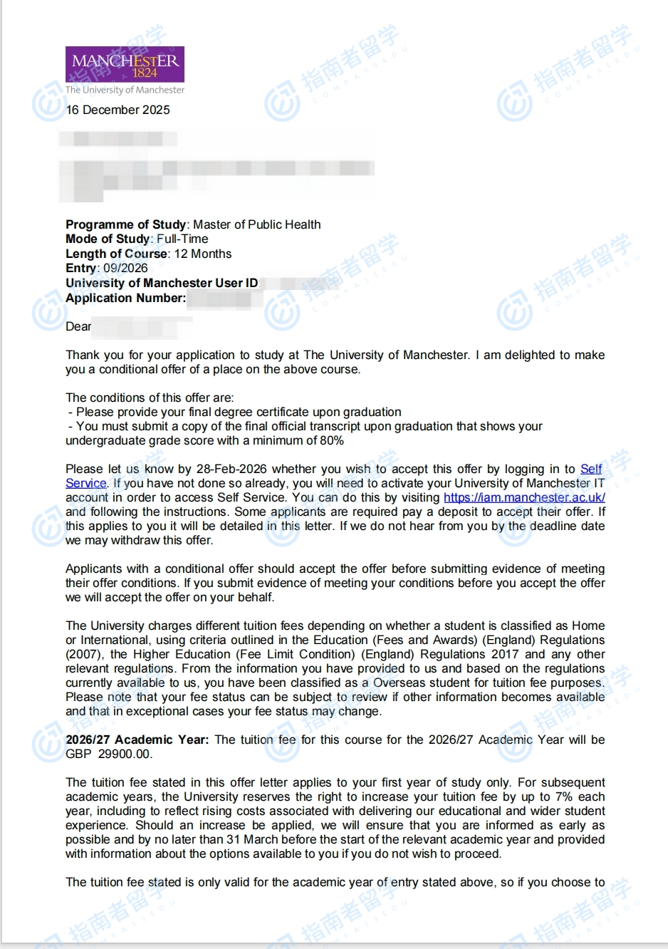曼徹斯特大學(xué)公共衛(wèi)生碩士研究生offer一枚