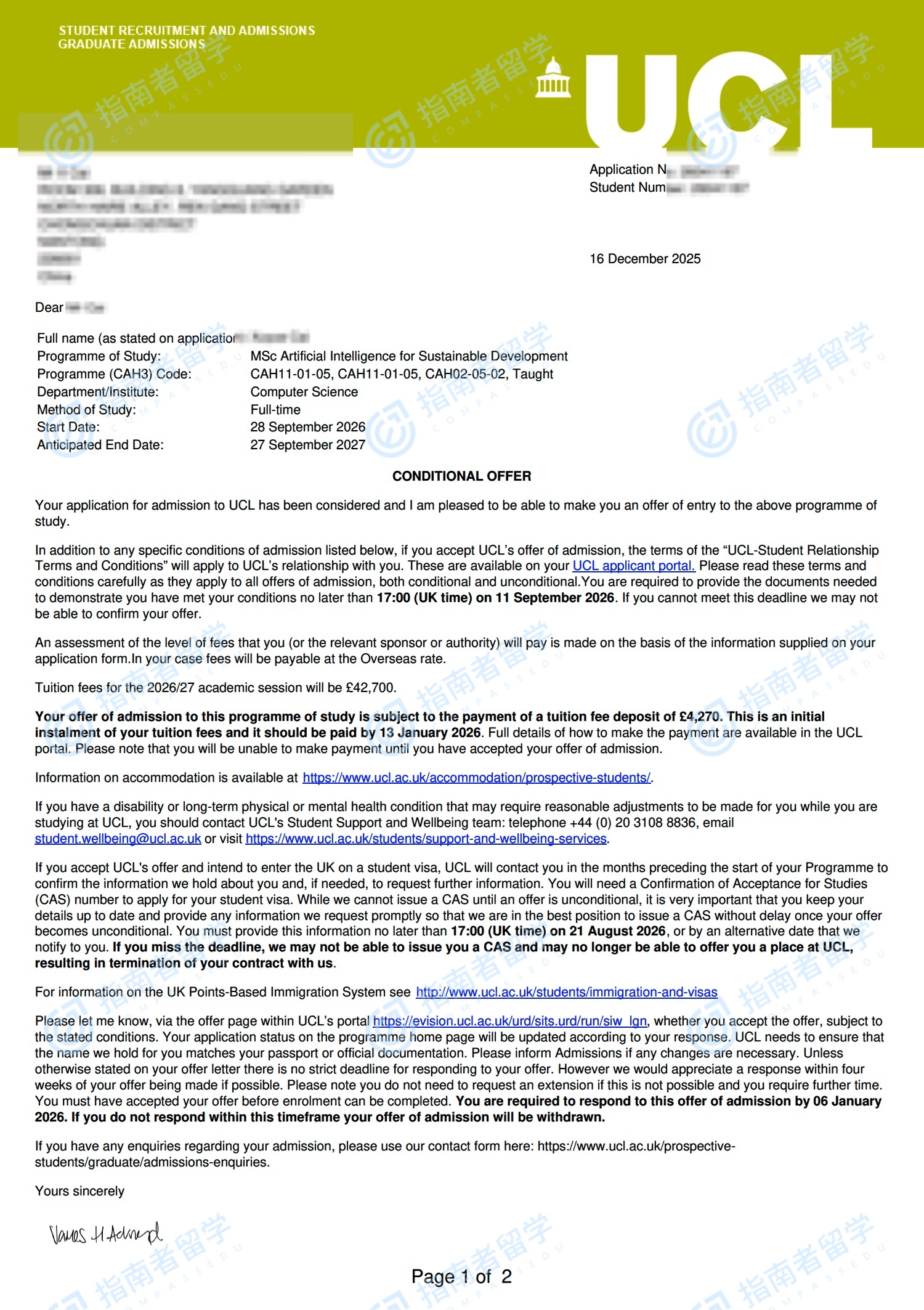 倫敦大學(xué)學(xué)院可持續(xù)發(fā)展人工智能理學(xué)碩士研究生offer一枚