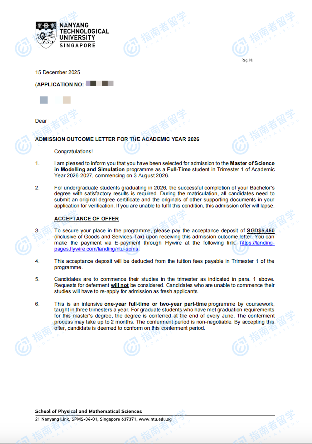 南洋理工大學(xué)建模與仿真理學(xué)碩士研究生offer一枚