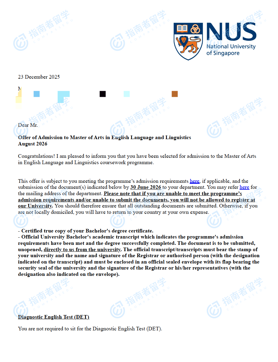 新加坡國(guó)立大學(xué)英語(yǔ)語(yǔ)言與語(yǔ)言學(xué)文學(xué)碩士研究生offer一枚