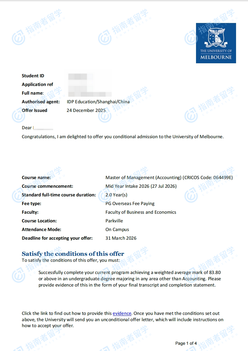 墨爾本大學(xué)管理學(xué)碩士(會計學(xué))研究生offer一枚