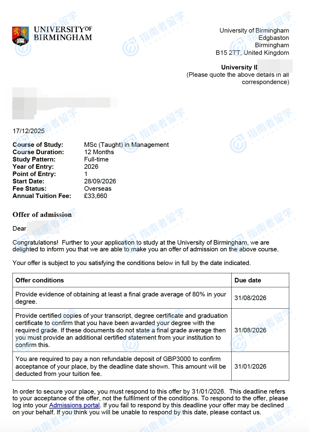 伯明翰大學(xué)管理學(xué)理學(xué)碩士研究生offer一枚