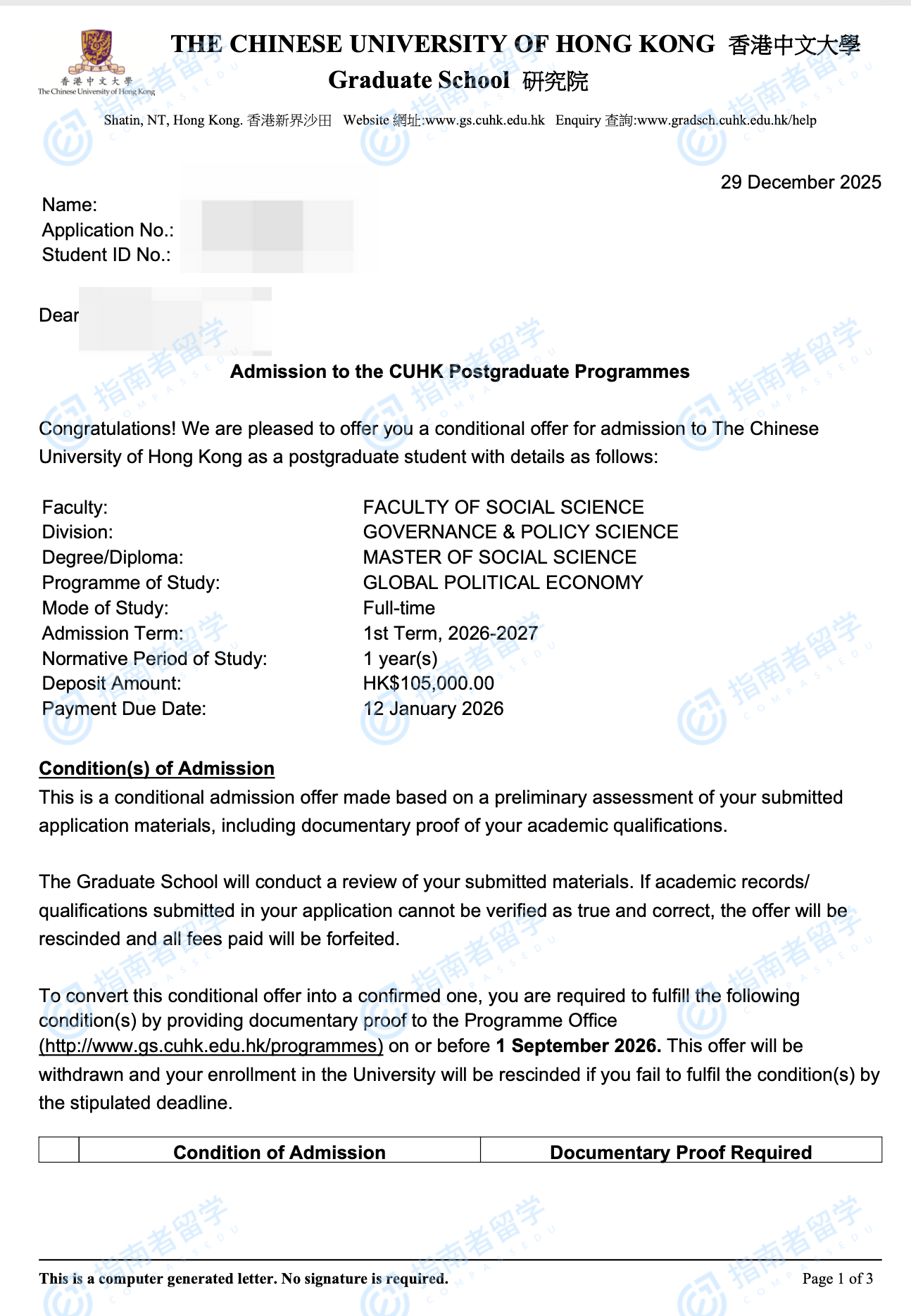 香港中文大學全球政治經(jīng)濟學社會科學碩士研究生offer一枚